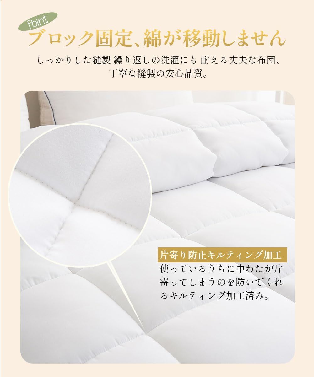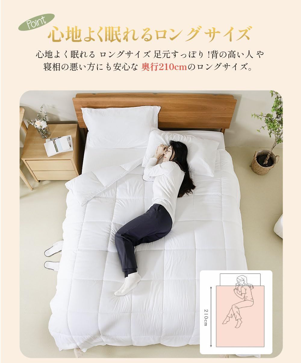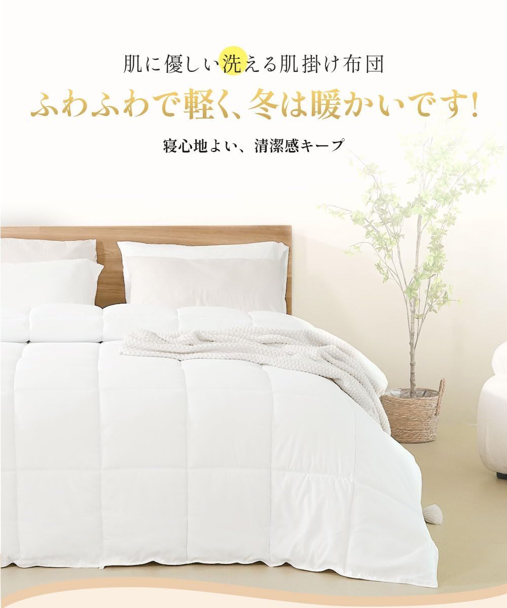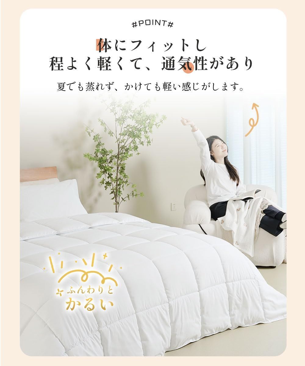 サイズ:150*210cm(シングル)総重量:1.8kg 、カラー:ホワイト 側生地:ポリエステル100% 詰め物:中空ポリエステル綿100% ズレずに:4ヶ所ループ付き